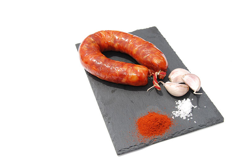 Carne magra de porco preto temperada com pimentão, alho e sal, cheio em tripa porco natural, fumado em lenha de azinho, 8 dias de cura