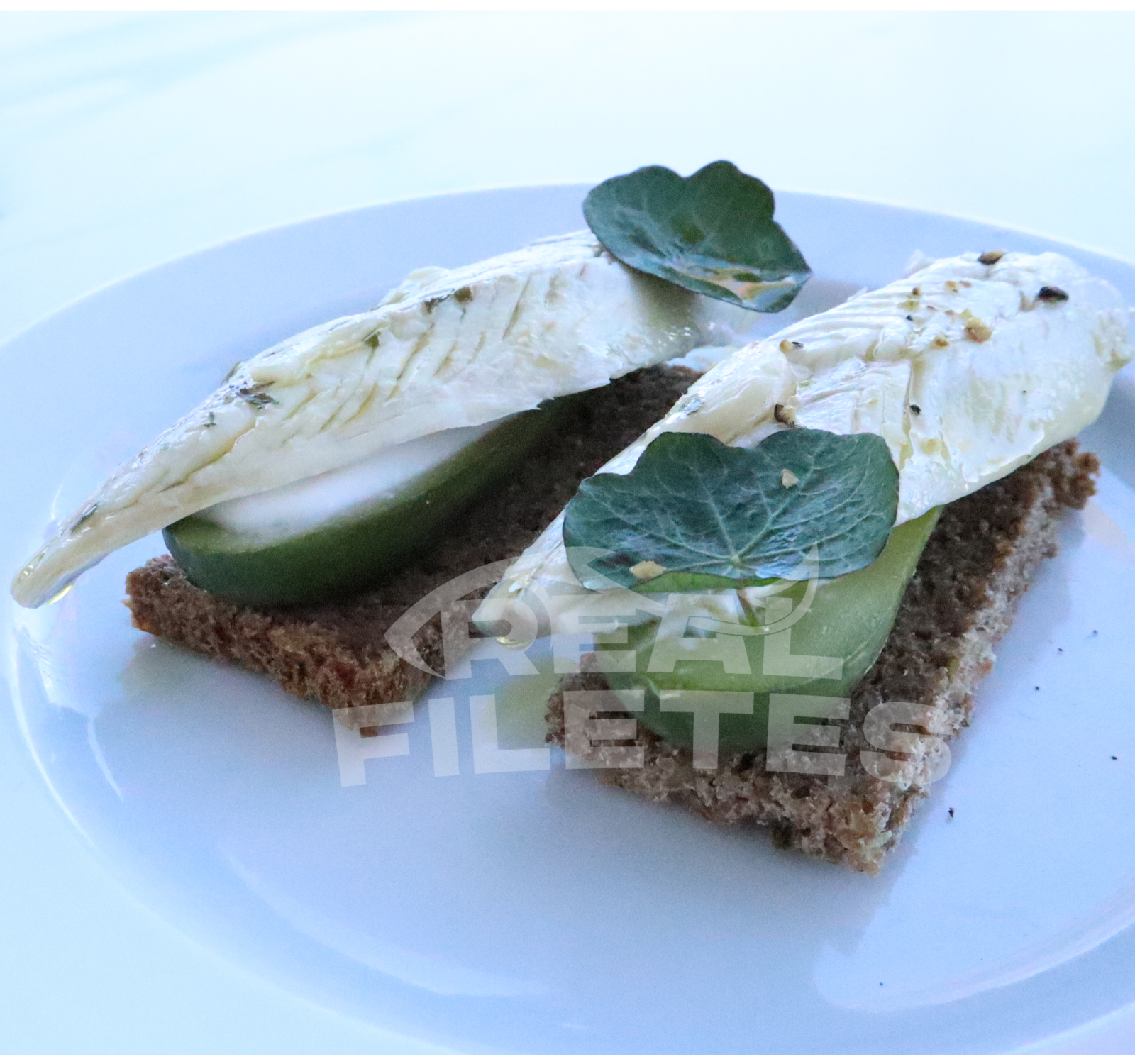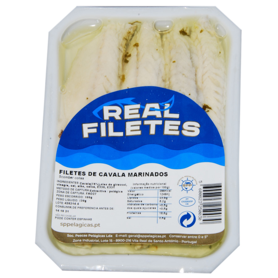 Filetes de Cavala marinadas em vinagre, acondicionadas em óleo de girassol, alho e salsa.