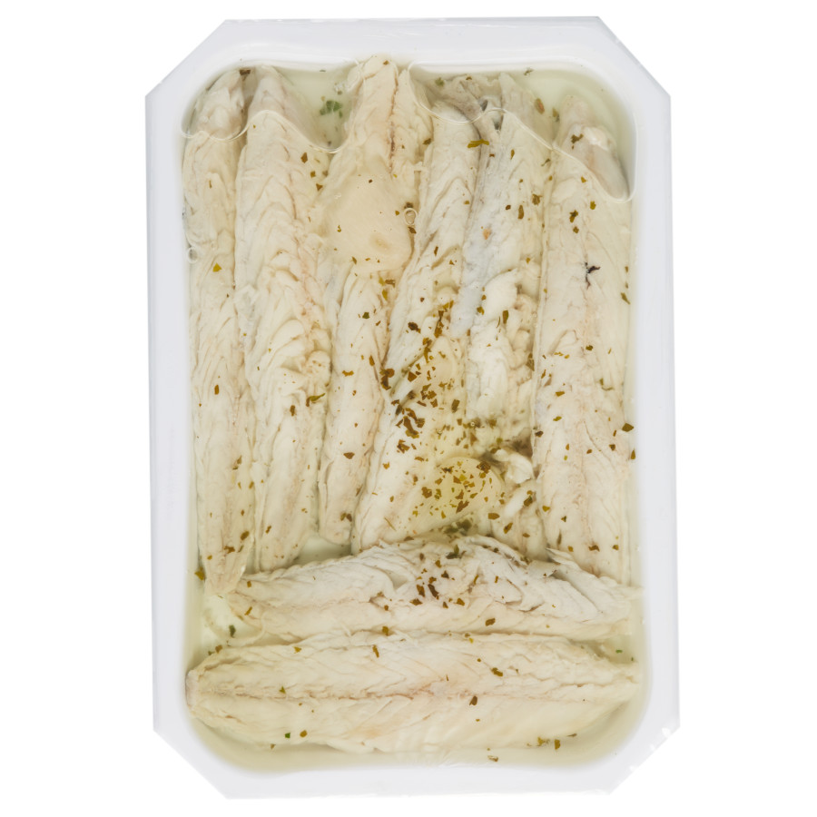 Filetes de Cavala marinadas em vinagre, em óleo de girassol, alho e salsa.