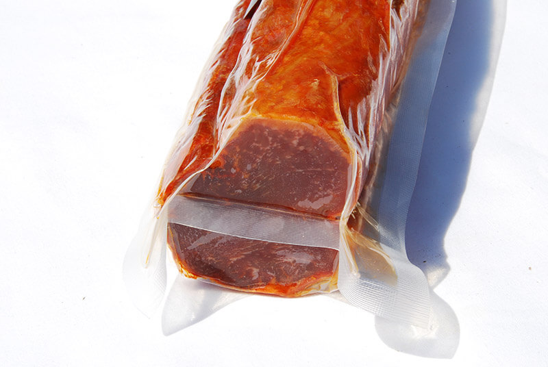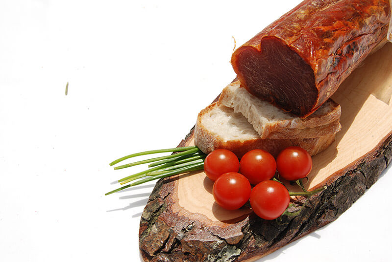 Lombo de porco preto temperado com pimentão, alho, sal, cheio em tripa artificial, curado a frio, 120 dias de cura.