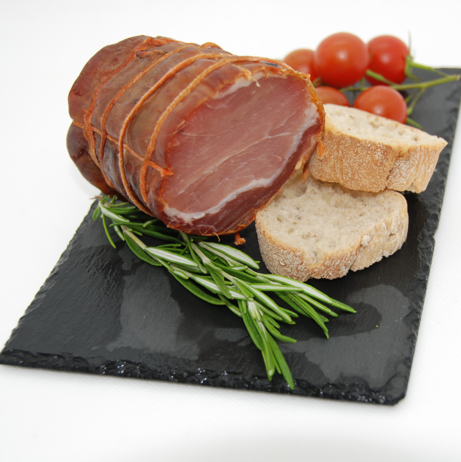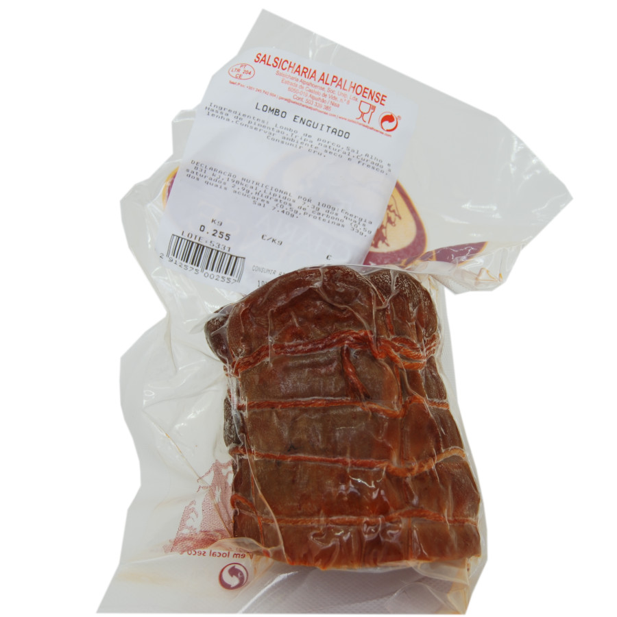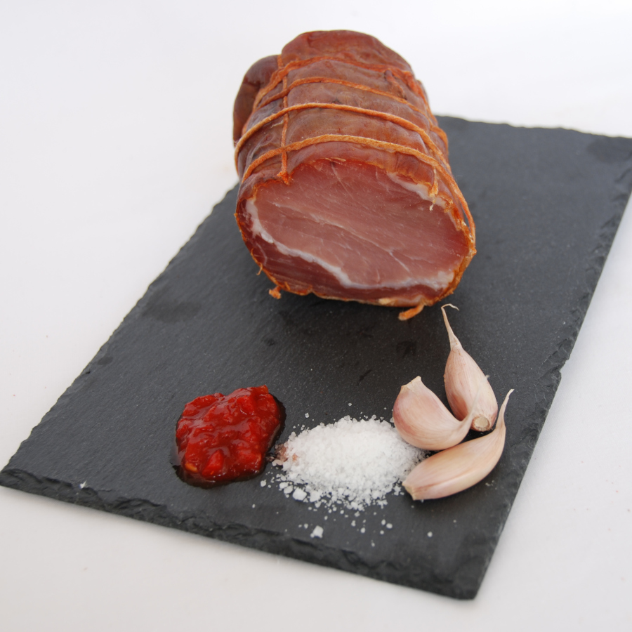 Lombo de porco temperado com sal, alho e massa de pimentão, cheio em tripa natural, fumado em lenha de azinho, 7 dias de cura