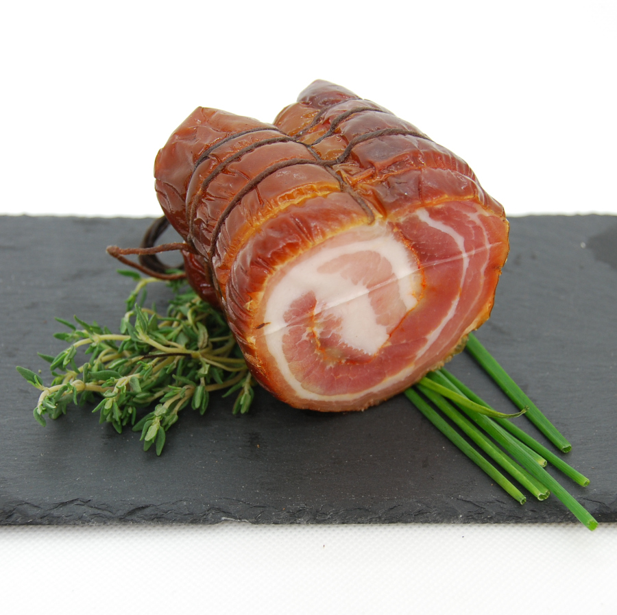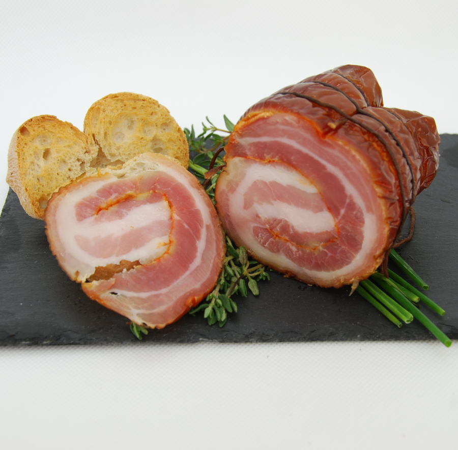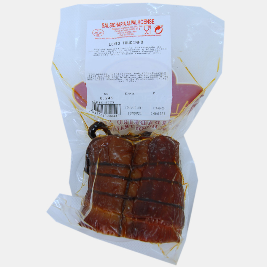 Toucinho entremeado de porco temperado com sal, massa de pimentão e alho, cheio em tripa artificial, fumado em lenha de azinho 20 dias de cura
