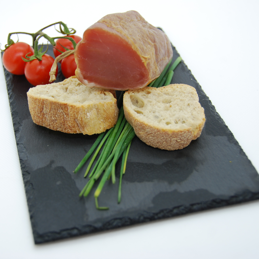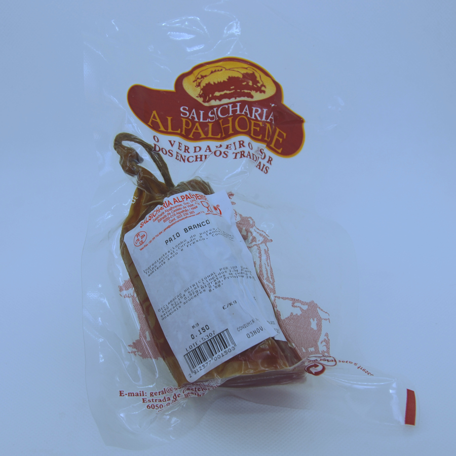 Lombo de porco temperado com sal e alho, cheio em tripa natural, fumado em lenha de azinho, 6 dias de cura